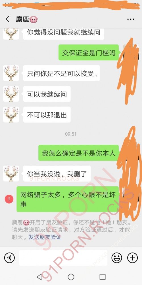 我又刚遇到一个夫妻骗子,在论坛里发帖还说他家有钱不需要任何费用,加V后就给你发各种照片,然后说让你参加活动,要交900元保证费,我问怎么证明是你本人,就直接把我删了,我已经把她的微信成功举报了,她论坛里的ID叫麋鹿MM,希望大家长个心眼。就是这帮人败坏了论坛的风气。[img][img][/img][/img]