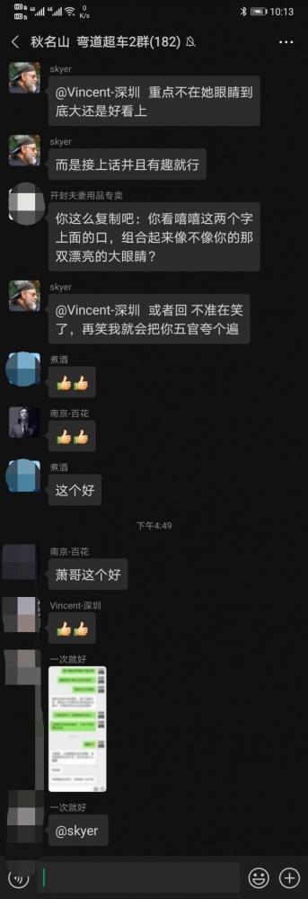 群里平时会给大家撩妹聊天过程中的建议和意见。同时一周一般我分享一次完整撩妹聊天记录同时附上聊天技巧的讲解。