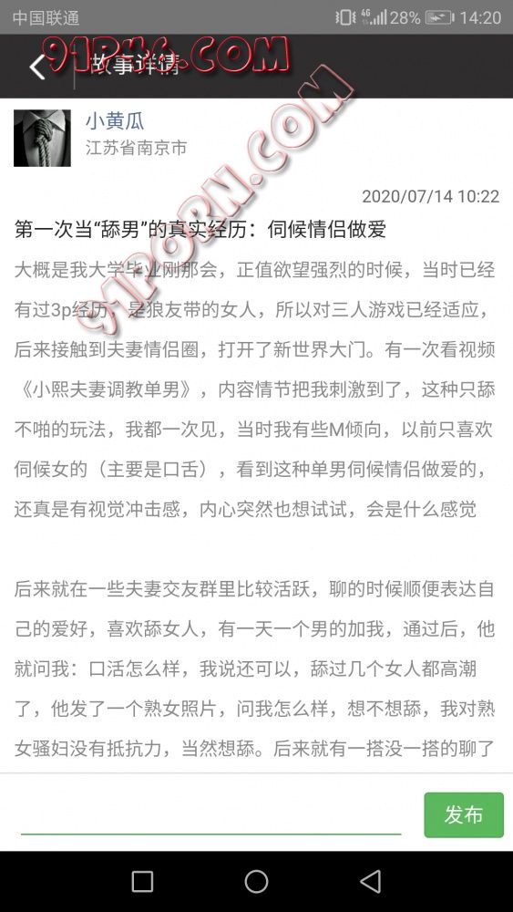 论坛上有夫妻情侣可能对这种玩法比较感兴趣,我坐标南京,喜欢当“舔男”角色,服务情侣做爱,遵守游戏规则,如有需要,欢迎交流:久琪爱爱溜叭琪久琪
