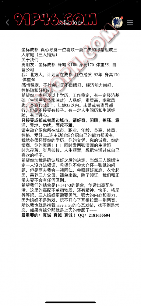 希望你加我是确认想好之后的决定,当然三人婚姻注定一人没办法领证,希望你不会太介怀一张纸的问题,但是两夫我会一视同仁,会照顾好家庭,衣食起居,善养三方父母。简单来说,除了领证,我们和正常夫妻不会有任何区别。