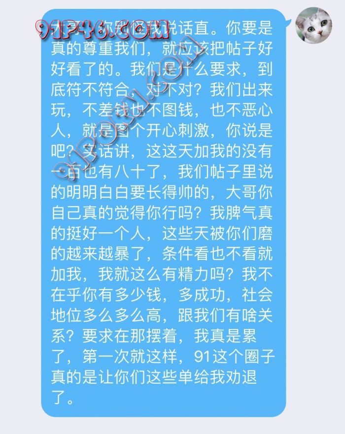 我今天发帖,主要是最近真的是心太累了。大家都说91上什么人都有,我一开始觉得夸张,现在我是真的感同身受了。从10月22号发帖到今天也有半个月了,加我的人也有了差不多一百多,坦白讲,没有一个合适的。我也想了想是不是自己的问题,但是真的,真的已经说得很明确了,要求都在上面写着,莫不是眼睛坏了看不到?