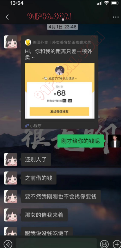 还有一种就是关系更近一点,甚至是已经睡过的,这种情况,你同样不能纵容她找你要钱的习惯。比如下面这个案例,这个女的第一次跟我约完会,我送她回家的时候说没钱买烟了,然后我就给她发了几百红包。我到家以后她又找我说钱用完了没钱吃外卖了,这个时候,我先是表明自己的立场,告诉她不能一个劲找我要钱,说完以后我还是给她点了外卖。对于这种已经跟我发生过关系的,我会稍微纵容一点。但是她一而再再而三跟我找借口要红包,我就不会再纵容她了。