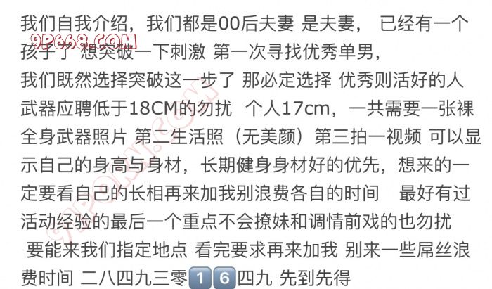 仔细阅读以下内容,优秀单男来联系 老婆说 第一眼看起来阳光暖暖的男生加分,年龄不低于24不高于28,达到要求可联系 我不缺钱 别试图用钱来打破这扇门 老婆是被服务型,一定要会舔会撩的,一定要有过活动经验的哦。希望你能在30分钟以上。上来就要活动要照片的有多远走多远 请把自己的优势介绍出来 然后 互相了解一下 再责日活动 心急吃不了热豆腐 感谢 .