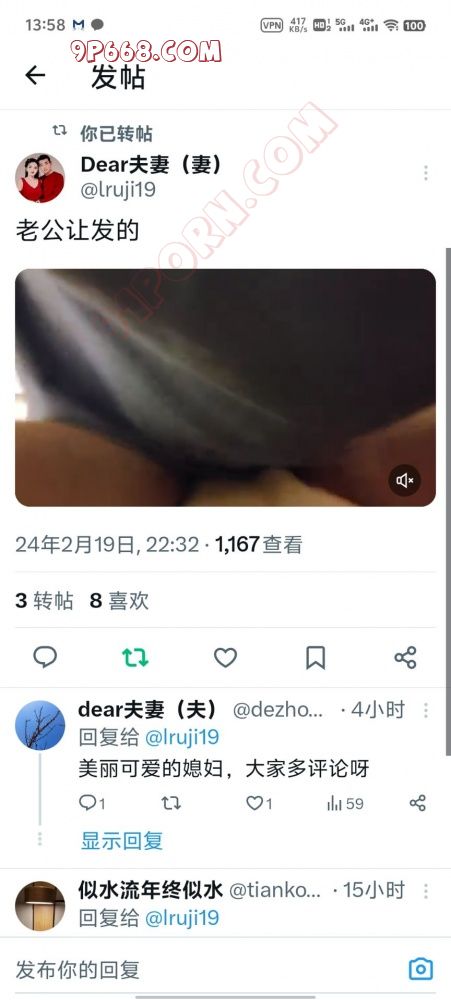 前天刚开始做爱怎么也不让我拍照,我给她吃下面,她还尿了点在我嘴里,受不了了,同意我拍了,做的时候拍视频了,最后我要求她拿着拍了一段。昨晚当她面用她的手机把视频发推特。文案是:老公让我发的。她喜欢把屁股抬起来,让我用俯卧撑类似的姿势操她
