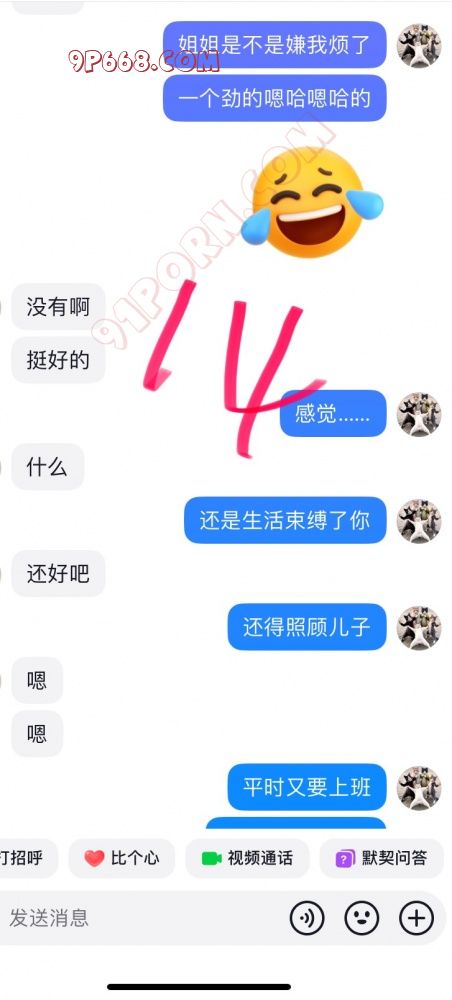 后来加了微信。可能那会稍微清醒了点!有点后悔了!但聊着聊着又自己发骚了!那天其实我有点忙的!她总以为我不理她!最后自己用手扣高潮了!水确实多!流了一地的水!听见她的淫水滴答滴答的滴下来!确实是个骚货!但是呢第二天估计进入了佛系状态!觉得对不起她老公!就把我拉黑了!这给我整得!我以为就到此结束了!没有后续了!谁知道晚上她又自己把我拉回来了!又是一顿发骚!很想和我文爱!那时候已经兜兜转转拉黑我好几回了!我慢慢也失去了兴趣!昨晚又找我聊!我故意为难她。后来又给我拉黑了!也无所谓了!白天给我拉黑!晚上想要了又给我拉回来!都说男的拔吊无情!女人干起这类事也是不遑多让!其实中间还有其他聊天的!我就截了一小段发出来了!其他的就不发了!这帖子算闭环了!各位江湖再见!