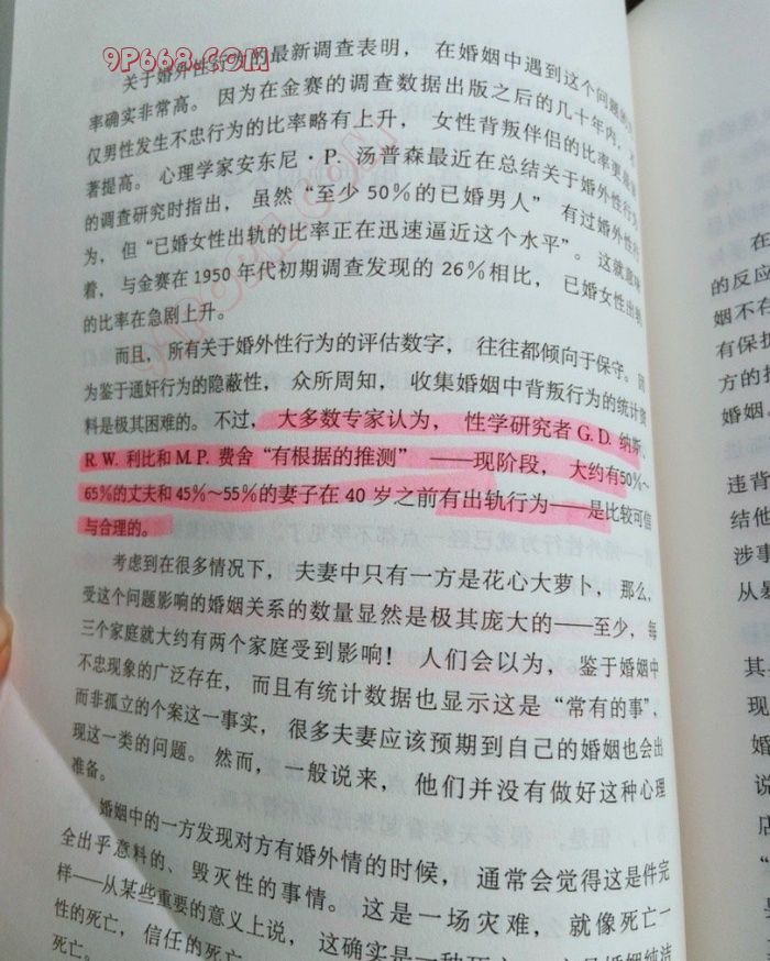 大多数专家认为,现阶段大约有“50%-65%”的丈夫和45%-55%的妻子,在40岁之前有出轨的行为——是比较可信与合理的。这本书首次公开出版的时间是1982年