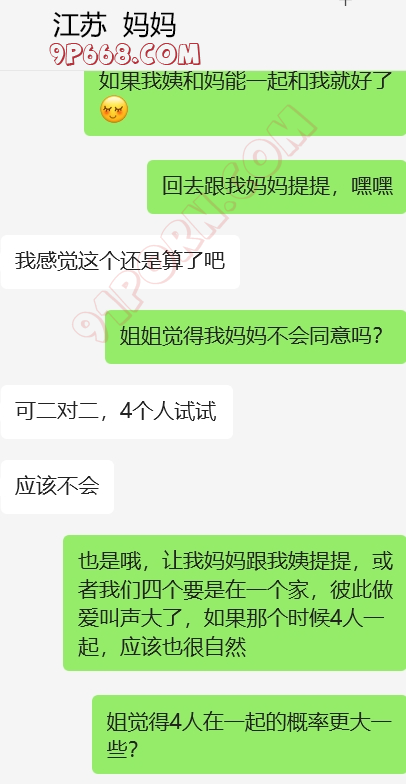 加入和表弟,我姨和我妈妈的4p话题,还有我妈妈和我姨的女女话题,哈。她还在那一本正经的帮我出主意,怎么才能4p。找了个粉丝,演我表弟,和表弟的对话发给她看。