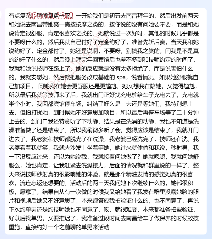 而两个月前人妻老公找到我时,该人妻还只有过老公一个男人,两个月我一点点线上指导老公开发,结果他们周边找了次SPA实在是单不给力,体验糟糕。我感觉到人妻潜力很大,一直遇不到专业单,窗口期过了后面再开发就难了。所以特意跑过去一趟亲自开发,效果见下面图片,多图预警,或者直接看视频。