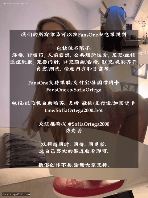 ------------------------------------------------------ 为了提升大家的观看体验和加载, 《不能看的秘密》全篇会分为 4 - 5个章节,每章节会有 60个动图左右。 均会附有时间戳,方便大家理清在视频中的时间线。 所有动图都是视频内容的截图, 唯一的区别就是发帖用 GIFs会加速 1.2倍,以保证整体动图整体数量降低。 ------------------------------------------------------ 欢迎关注推特/X 和电报,以保持对最新作品的关注。 Twitter/X: @SofiaOrtega2000 Twitter/X: @JacksonYan444 (我) 免费电报咨询群邀请链接: ----------------------------------------------------- 《不能看的秘密》 第一章 [64GIFs+ 4P] 开始 黄色为索菲, 绿色为我, 蓝色为赞助人。 视频时间 00:00 - 01:17 计划了好几个月的旅行终于踏上征程了, 我们的首站便是新加坡,旅程32个小时。 从波哥大飞 12小时到了伊斯坦布尔转机。 索菲自说自话买了一盘不知道是什么的东西... “干你不如吃土豆。”她使用了谚语一击,对我的高空邀请进行反馈。 “有比没有好!No zuo no die why you try!”我丝毫没惯着她。 “Try 就 try!看看谁先die!” 而我们的旅行就在这样的氛围下开始了... 落地新加坡已是晚上,长途跋涉很累。遂决定先洗洗睡。 隔天的稍晚就是与赞助人见面的约定时间,需要精神饱满。 第二天早,我先醒来,但索菲还在酣睡。 深知如果此时不抓住机会,那就只能等到赞助人之后了。 晨木也硬挺挺的点头同意。 我开始用手小心的试探着索菲的意愿。 从上到下,从前到后,努力着把握着温柔唤醒的尺度。 就当我觉得时机成熟, 脱下她的大妈同款内裤,胜利仿佛就在眼前。 我一脚踹下被子,但此刻大姐的声音悠然传来。 “你敢现在弄醒我我就弄死你。” 目标失败,晨木卒。 大姐过了没有五分钟,伸了个懒腰拉开了窗帘,洗澡化妆。 旅行第一天的兴奋感让索菲如同打了鸡血,迅速待备整装出发。 在出租车前往景点的路上,她兴奋的看着周边的建筑。 用手机记录着她的旅途。 第一次去新加坡必然少不了看金沙酒店和嘴接鱼尾狮圣水 海拔 0米赤道的阳光, 让索菲迅速进入了“走不动了我饿了”的状态。 街角吃了个冰淇淋便找到一家烤肉店乘车前往。 吃完烤肉在商场里逛了逛,不知不觉时间来到下午两点。 因为哥伦比亚的首都波哥大正在修第一条城市轨道交通。 并且这条线路是由中国承建的,遂提议让索菲坐地铁感受下区别。 “你会坐新加坡地铁么?你别找不到路了。” 由于之前小妖精在墨西哥城坐地铁的体验不是很好, 她开始推脱我的建议。 “大姐这不都是中文么,线路指示颜色这么清晰还能看错了?” “那你知道怎么买票么?你不是说你也没坐过。” “Apple pay就成。” “我不信。。。”小妖精一脸狐疑皱了皱眉。 呵呵。。。 成功用Apple pay刷进了闸口, 索菲惊讶于其整洁与东亚人零狐臭对乘坐体验的增持。 但问题又又又来了。 “他们怎么都宁愿站着也不坐我旁边?” 此时目光所及之处的位置都以坐满, 还有不少人站着,但唯独索菲两侧的座位是空的。 不知道有没有高人能为索菲解释下。。。 但无论如何, 她已经从电视剧导演们想呈现的亚洲幻想, 进入到正好距离哥伦比亚最远端的国家新加坡, 开启了她的亚洲之旅。 视频时间 01:18 - 04:37 画面里面没录到,但是可以听见“啪”的一声。 玩弄下,索菲小穴的汁水开始外溢。 呼吸也变得越来越急促。 视频时间 04:38 - 08:33 不得不说小哥的指法虽然没有在镜头得到中展示, 但索菲的反馈却非常清晰。 上一秒沉寂,下一秒仰天, 不时笑笑调戏我的神经,却又被手指的抠回了当下。 她的情绪在数秒内跌宕起伏。 此时的视频中,由于索菲淫水流个不停。 她自己也听到了手指搅拌发出的“滋滋”声。 “水好多...” 她自己也感叹到。 赞助人的条款,也有他的弊端。 那就是无法通过观察索菲的表情,来知晓索菲当下的状况。 从我的角度可以清晰的看到,她已进入性快感上升的区间。 但他并不知晓... 决定提枪上阵... 她小穴多日以来的空虚感,开始被“啪啪”声被填充。 爱人决定最大化性快感,在他的抽插下开始自己动手。 视频中此时的音量随着索菲手的加入,突然大幅增加。 因为我们平时都是拍第一人称视角POV的,她会注意表情管理。 但是这次是固定的近距离第三视角,而且被后入。 所以她没有注意表情管理,最真实的状态暴露了出来... 可以看到一只眼睛直接被干的抽搐了... 蜜穴此时一定又滑又紧,很强的吸力。 他加快了速度和力度,冲向索菲的更深处, 索菲立刻对他探索有了无法掩饰的反馈。 力的是双向的。 在他用力深入的同时,索菲的蜜桃也对他进行着反噬。 他在用力插入几下后,开始了急喘。 虽然可以看到他在最后试着放缓速度, 但几经挣扎还是光速缴枪了... 视频时间 08:40 - 10:44 但他的手指只是随意的玩弄一下,没有留恋。 毕竟交的钱,不是为了爽手指的... 受到了爱人口腔的贴心护理,它迅速成长为完全体。 面对一只品项优良的无毛鸡,索菲越吃越起劲。 索菲则谨记他的条款,不能直视他。 一把撩开了碍事的头发,埋下头, 开始向金主爸爸毫无保留的展示自己拥有的技能... 《不能看的秘密》第一部,第一章完。 赠人予赞,手有余香。 JacksonCouple 诚意奉献 ------------------------------------------------------ 我们的作品包括但不限于。 •NTR/绿帽 • 3P • 偷窥 •人前露出 • 公共场所性爱 • 足交/丝