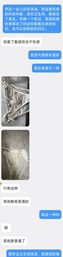 事情的发展比我们想象的更顺利,弟弟被激发了欲望。刚洗完澡,弟弟立马跑到姐姐房间,和姐姐聊他的感情,说怎么怎么不顺利。很明显这是在找话题,这一下让姐姐手足无措。还好姐姐随时在和我聊天,我让她稳住阵脚,只聊一半就去洗澡。按照既定计划走——在卫生间放置姐姐性感的丝袜和内衣