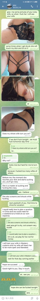 本帖最后由 默默 于 2025-12-2 10:32 编辑 西欧人说话果然比较直白,不像东方人那么含蓄,喜欢直来直去,聊天也不累,挺舒服。给他看了我老婆的身材和B,咪咪,他就说想什么招式玩。 给我发了他老婆的照片,说他老婆如何淫荡,擅长口交,等等。 下一次一起视频做爱体验一下,有感觉的话,我们去欧洲或者他们来中国。交流切磋一下。 含蓄聊天挺好,偶尔体验一下不同的方式也挺好。 话不多说,上两张聊天截图。 还有另一个美国老教授,拉丁裔,说每年都要来国内几次,因为他不带老婆来,不能让我操,所以不怎么交流,对他兴趣不大。这老头对我老婆倒是很上头。