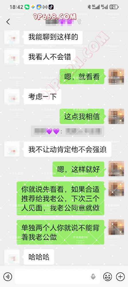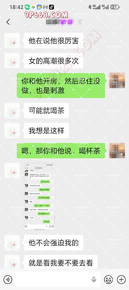 之后老婆就夸照片里面的男的鸡巴很大,这个单男就和老婆说,图片的男的鸡巴其实很小,他自己的鸡巴更加粗大。然后就勾引我老婆,要当面给我老婆看,就只是看看,不做也可以。然后就一步步的,老婆被约去酒店开房了。剩下的过程就看截图吧。这次总的来说,感觉很刺激,老婆第一次和单男去开房,整个过程对我来说,很煎熬,见完单男后,我们迫不及待的想要见到彼此,然后见了面就是疯狂的做爱了,确实能刺激到,增加性爱的激情。