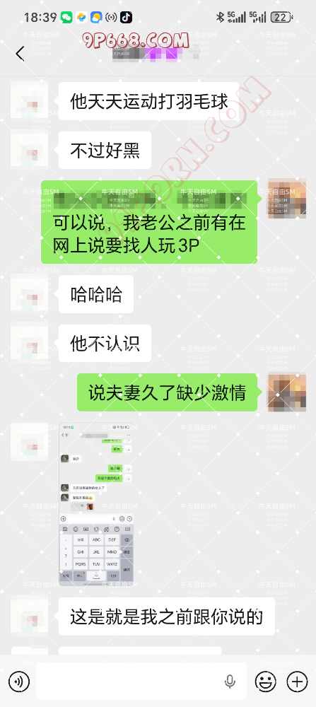 开头简单的说一下老婆和这个男的是怎么认识的,老婆跟他认识有2年了,是以前一起打羽毛球认识的球友【简称单男吧】,之后偶尔有联系,老婆也没怎么跟他聊,这男的偶尔也会发一些色图,想勾引我老婆吧,我老婆的原话是老公,他想操你老婆。这次老婆和他约,也是从他突然发了2个QQ聊天记录截图开始的,是一个女的和5个男的大战的聊天截图,引起了老婆的好奇心。之后老婆说图片中的鸡巴好大,单男这时候直接说自己的鸡巴更大,老婆直接被勾起了好奇心,单男也趁机约老婆去酒店开房看。老婆说想先看看照片,单男就拍了他的大鸡巴照片发给老婆看,确实是挺大的。老婆也有想看的冲动。老婆也和单男说开房的话只是看看,不做爱什么的。就是单纯的看看他的大鸡巴。这里我感觉老婆还是比较单纯,真到了酒吧开房,就不是那么好控制的了,你们说对吗,男的精虫上脑,就不会说不做就不做的。这件事的起因有一部分也是最近我们夫妻做爱感觉也比较平淡了,本身也想着看能不能找点刺激来增加激情,正好早上单男给老婆发来了2张QQ聊天记录截图,老婆就发给我了,我就鼓励老婆和他聊聊看,之后就有了本次的老婆单约羽毛球友的故事。具体过程我用图片展示,欢迎大家看了评价,老婆会看。